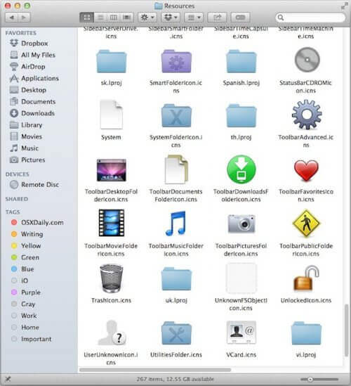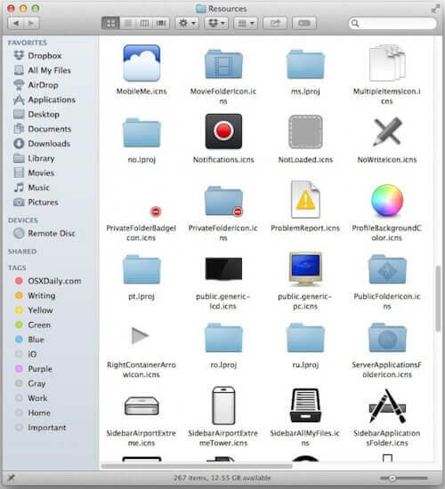 在目录中你将发现一大批 .icns文件. 他们就是原始的图标库并包含了不同尺寸的图标文件在内.像缺省的 Application , Documents,Desktop,Downloads,Developer,Group,Library,Music 等等一系列图标都在这.